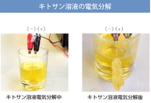 キトサン溶液を電気分解すると、電気分解後には、マイナス(-)電極側(赤)にはプラス(+)帯電した物質が析出し、キトサン溶液には+の電荷を持った物質が存在していることが分かります。この+の電荷を持った物質がキトサンです。